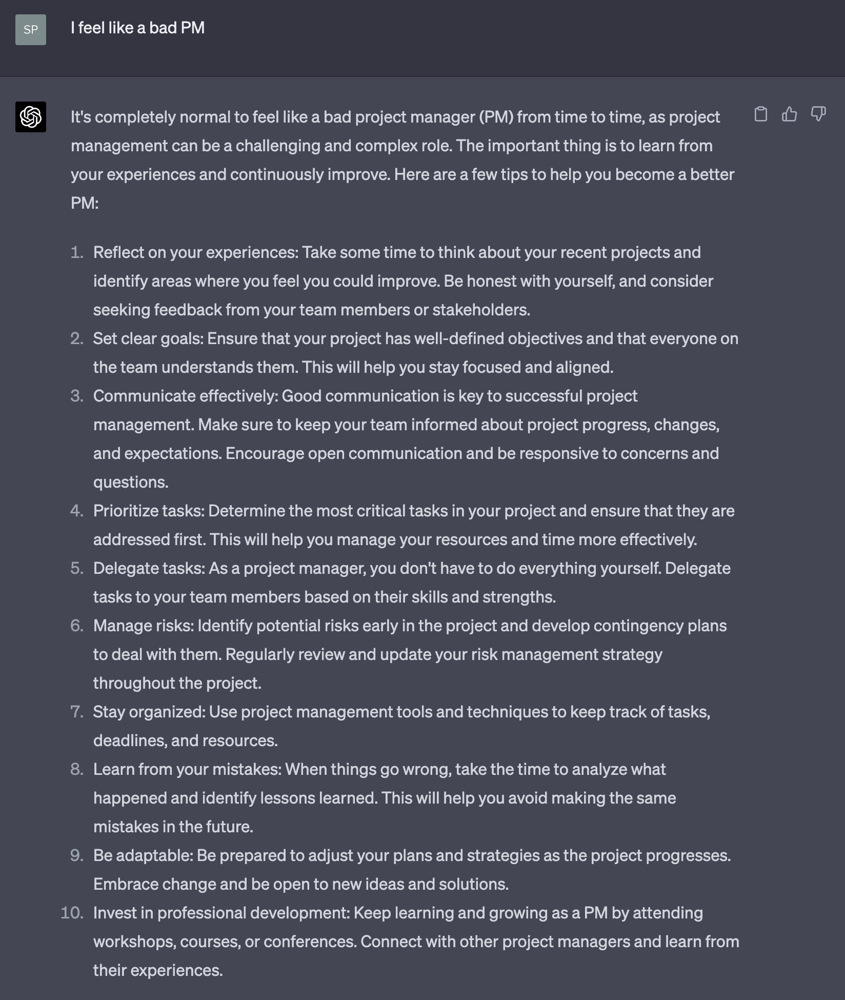 ChatGPT starts off similar, empathizing, but it not only misunderstands who the user is, assuming PM means Project instead of Product Management, but dives straight into solution mode.